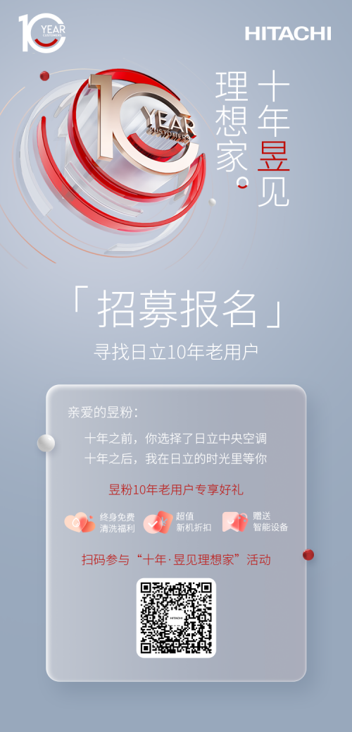 10年,變的是時間,不變的是品質。未來,日立中央空調將繼續以用戶需求為本,創新科技、鍛造品質,用真誠的服務贏得用戶信賴。日立十年,一路陪伴,一起成長!