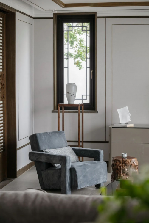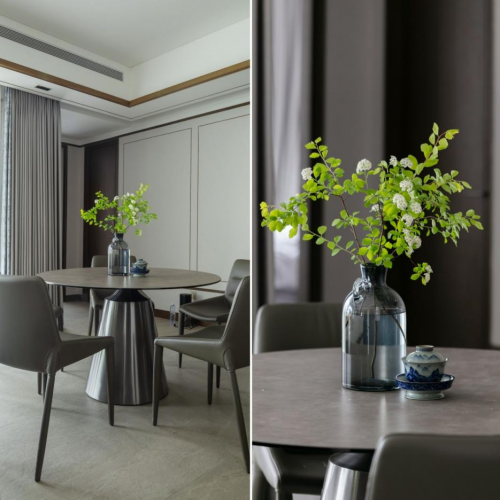 室內(nèi)以灰色系為主,造景取舍里傳承東方設(shè)計講求的對稱之美,但是設(shè)計師韓木通過巧妙的設(shè)計技法,從色彩、配飾、陳列等整個空間美學(xué)體系,以和諧、端秀、恰如其分的表達生活應(yīng)有的態(tài)度。