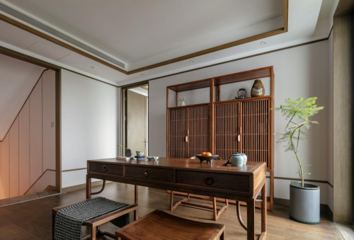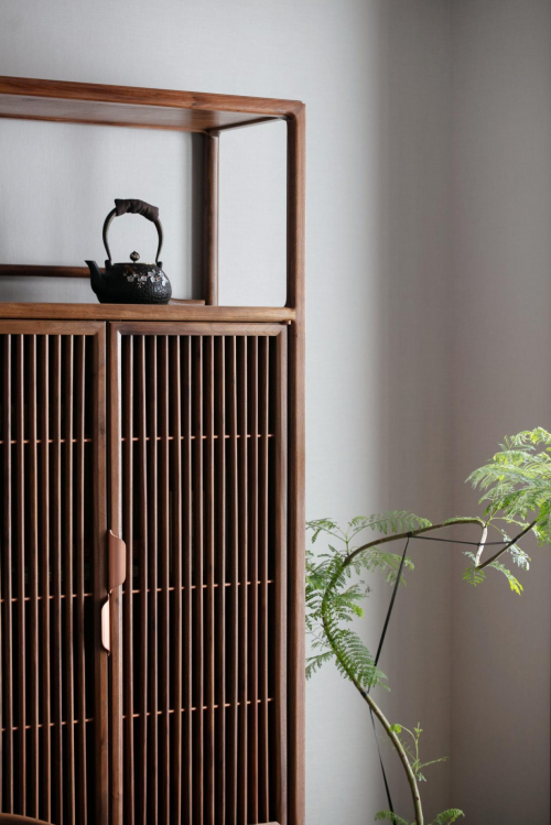 在茶室里,一瓷一器,以精致的方式與日復(fù)一日得以悉心照料的綠植相映襯,盡顯東方茶室的禪靜;屋主收藏的茶器、邊柜散發(fā)出的木香,在這個東方茶鏡的空間里,注入了對生活的用心與熱愛,讓時光慢煮,寫照著優(yōu)雅。