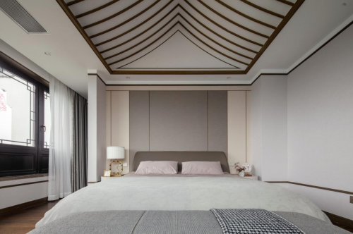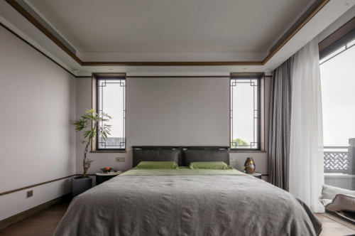 整個臥室中式以建筑設(shè)計為基礎(chǔ),大面積地采用柔和的灰色與木色,常見的材料,力求保留著中式最原始的質(zhì)感,卻以簡化的方式傳遞現(xiàn)代居所應(yīng)有的寧靜。