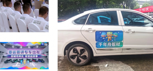 千年舟作為協辦單位助力的亞運宣講專車已遍布杭城角落,身著千年舟專屬文化衫的司機們穿梭于大街小巷,在每一場邂逅中與乘客訴說亞運與杭州的故事,其中還有數千輛印有千年舟標識的專車,也時刻等待著與大家偶遇。
