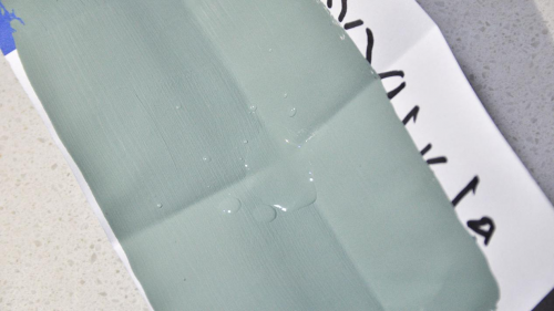 在測試防水能力的時候特地加強了難度,把紙對折了兩次,再在折線中心點灑水,一方面看漆的防水能力,另一方面看漆膜韌度。結果可見,水珠被隔絕在漆面外,絲毫沒有滲透的跡象。