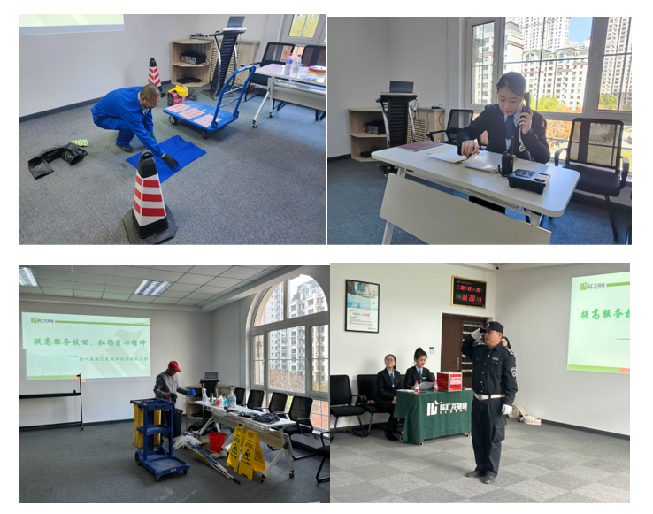 本次技能比武大賽分為崗位技能實操與理論考試兩部分,崗位技能實操部分圍繞專業理論知識、技能規范考核、服務場景展示、消防安全模擬等展開。由欣匯龍物業總經理譚鋒、業務副總林智強、業務副總田卓、品質部經理錢曉丹、客服條線負責人郗曉燕、秩序條線負責人曹健、環境條線負責人閆麗麗7人組成的評審團,依照公平、公正、公開的原則,多維度考評客服管家、秩序維護、環境保潔、工程維修四個隊伍的綜合能力。