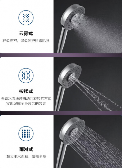 除了炫酷的外觀,科勒水樂章多功能手持花灑更有著不同凡響的“內在美”。它讓你的淋浴徹底告別了單一水型,豐富水型讓淋浴變成了不一樣的享受,帶給你沉浸式的幸福體驗。打開花灑,你可以選擇雨淋式水型,有130mm超大出水面積,覆蓋全身,享受大雨的酣暢淋漓。你也可以選擇按揉式水型,強勁的水流通過扭動和旋轉的方式,形成緩慢的、有節奏的按捏效果,仿佛有一雙手在給你按摩,可有效緩解身體疲勞。當然,你還可以選擇云霧式,讓超細柔和的水滴匯聚在一起,輕撫你的身體,宛如置身溫暖的環抱中,帶來幸福的淋浴體驗。科勒水樂章多功能手持花灑共有3種豐富獨特的水型,不同舒心體驗,總能滿足你的需求