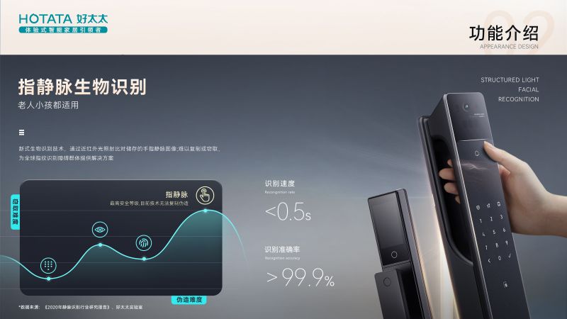 它擁有多種解鎖方式,其中最為便捷的是人臉識別和指靜脈識別方式,無論是粗心忘帶鑰匙,還是手提重物不方便翻找鑰匙開門的情況,都可以通過這兩種方式識別開鎖,而且安全性也很高。其中人臉識別系統(tǒng)是采用活體深景檢測,紅外光投射器經(jīng)DOE衍射到人臉上,采集計算得出每個投射點(diǎn)的三維深度信息,可以防止照片和視頻冒充解鎖。而指靜脈識別,是一項(xiàng)新的生物識別技術(shù),因?yàn)橹胳o脈信息唯一且無法仿制,且識別過程必須是有血液流動的活體才能識別,安全性也升級到新高度,識別速度更快,不到半秒時間就能識別開門了。