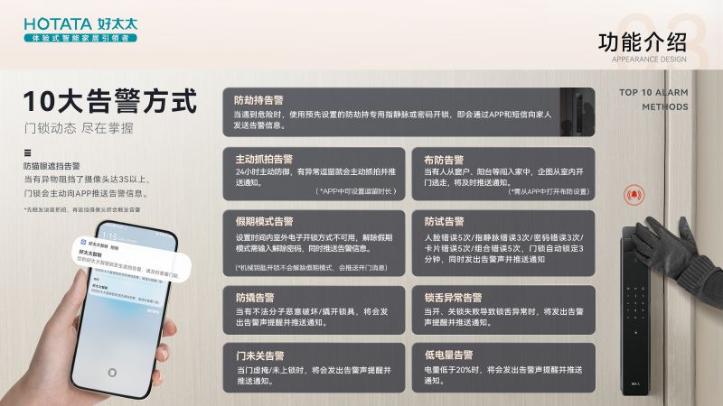 除了解鎖方式高度智能化,它還設(shè)計有十大告警方式,基本囊括了日常用鎖有可能遇到的痛點(diǎn)問題。比如平日里因?yàn)榇中幕蛘哂屑笔鲁鲩T,匆忙中沒有關(guān)好房門,這時好太太智能鎖就會發(fā)出告警信號,提醒用戶關(guān)好房門,化解未知風(fēng)險。還有這款好太太智能鎖搭載了厘米波雷達(dá)感應(yīng)器,如果有人在門前徘徊,異常逗留,就會觸發(fā)偵測抓拍功能,并把圖像信息實(shí)時推送到手機(jī)。隨時隨地都能了解家門外的狀況。