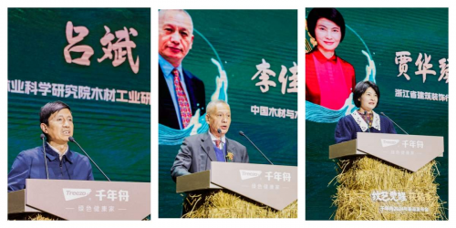 現(xiàn)場,中國林科院木材工業(yè)研究所副所長呂斌先生、中國木材與木制品流通協(xié)會會長李佳峰先生、浙江省建筑裝飾行業(yè)協(xié)會會長賈華琴女士等領(lǐng)導(dǎo)蒞臨大會,并登臺致辭,為此次大會送上衷心祝福。