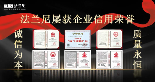 法蘭尼連續三次蟬聯“企業信用評價AAA級信用企業”,其企業信用等級評定均為“AAA級”最高評級,信用提示“信用優良”,釋義“公司信用管理基礎完善,信用能力強,誠信度高,發展趨勢樂觀,綜合能力處于行業領先水平”,獲得該評級意味著法蘭尼企業具有最高的信用記錄,經營狀況最佳,債務風險小,發展前景廣。