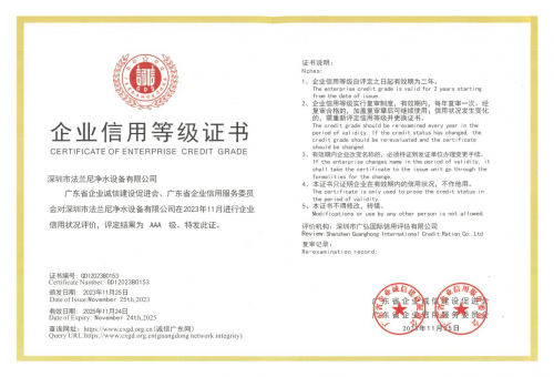 法蘭尼連續三次蟬聯“企業信用評價AAA級信用企業”最高評級認定,既是對公司的信用水平和經營能力的肯定和認證,同時也是對公司勇立潮頭、奮進創新的一種激勵和鞭策!作為凈水器十大品牌高新技術企業,法蘭尼將始終堅持誠信立企興業,傳承工匠品質,優化企業服務,不斷強化契約精神和履約意識,重合同、守信用,持續加強企業誠信體系建設,展示誠實守信的企業形象,旨在為客戶提供更高品質的產品和更專業化的服務!