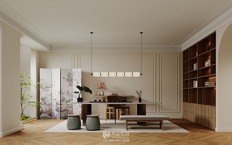 設計師利用經典的魚骨拼地磚、石膏線條、裝飾畫、折疊門、清爽蔥郁的綠植,為空間增加輕盈感和自然感,打造出通透愜意慵懶的公區空間。