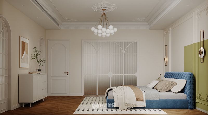 主臥沿用的還是與其他看見一致的奶白色,同時借用深藍色的床來營造空間的靜謐感。對稱式設計的背景墻再利用綠色塊打破對稱感,簡約而又不失俏皮感。