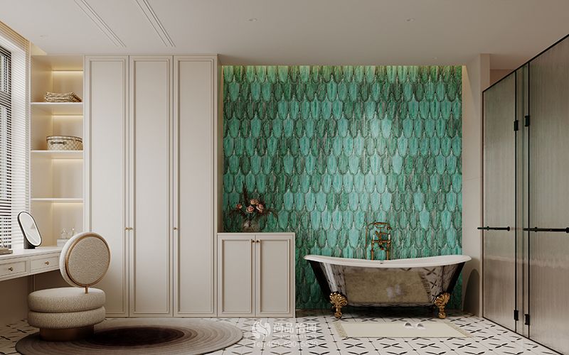 由于三層空間較為豐富,且業主注重自己私密生活,所以設計師將主衛往大氣舒適方向打造,利用玻璃門進行干濕分離,同時選用有層次感的綠色瓷磚點綴浴缸墻,強調藝術與優雅。靠窗區域,設計師則設計了桌椅等,并加入梳妝鏡等物件,滿足女業主梳妝需求。