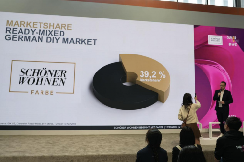 作為德國國民涂料品牌,SCH?NER WOHNEN-Farbe在德國備受當地居民青睞。不僅獲得德國國家設計獎、德國品牌獎、德國產品冠軍榜第一名等重磅獎項,Frederik Strotmann還給大家分享了SCH?NER WOHNEN-Farbe預調色系列2023年上半年德國市場的市場份額:39.2%。
