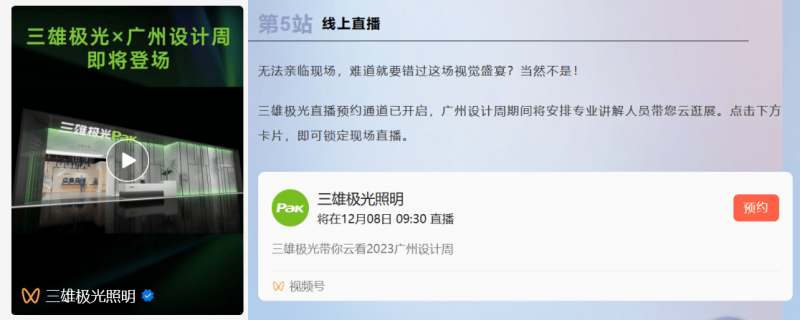 三雄極光在廣州設(shè)計(jì)周還未正式啟幕時(shí),便已在官方視頻號(hào)發(fā)布參展預(yù)告視頻,并發(fā)起直播預(yù)約通道,同時(shí)邀請(qǐng)多位業(yè)界設(shè)計(jì)師精英拍攝打call視頻,進(jìn)行大力宣傳預(yù)熱,吸引更多設(shè)計(jì)師的關(guān)注。而在為期四天的廣州設(shè)計(jì)周期間,由專業(yè)人員在現(xiàn)場(chǎng)直播詳細(xì)講解,為大家揭曉驚喜。這也成功吸引到了現(xiàn)場(chǎng)觀眾的注意,紛紛到一旁聆聽,或轉(zhuǎn)發(fā)直播給親朋好友,視頻號(hào)評(píng)論互動(dòng)區(qū)也一同熱鬧起來。與此同時(shí),在廣州設(shè)計(jì)周首日便通過視頻號(hào)發(fā)布展位記錄視頻、盤點(diǎn)設(shè)計(jì)師高關(guān)注產(chǎn)品的主題視頻,持續(xù)輸出優(yōu)質(zhì)視頻內(nèi)容。