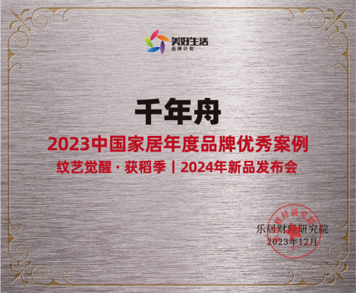 “2023中國家居年度品牌優秀案例”從家居企業品牌案例創新展現、傳播方式、品牌價值傳遞、品牌形象塑造、信任感建立、品牌美譽提升度等多維度考量,綜合評選得出。經過一系列激烈的競爭,千年舟的“紋藝覺醒 · 獲稻季丨2024年新品發布會”脫穎而出,榮獲“2023中國家居年度品牌優秀案例”。