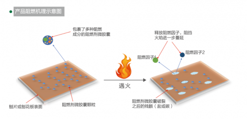 板材受熱時,刨片表面的微膠囊破裂,吸收熱量,同時釋放的高效阻燃因子能稀釋燃燒區域的可燃物濃度,有效抑制火焰蔓延。