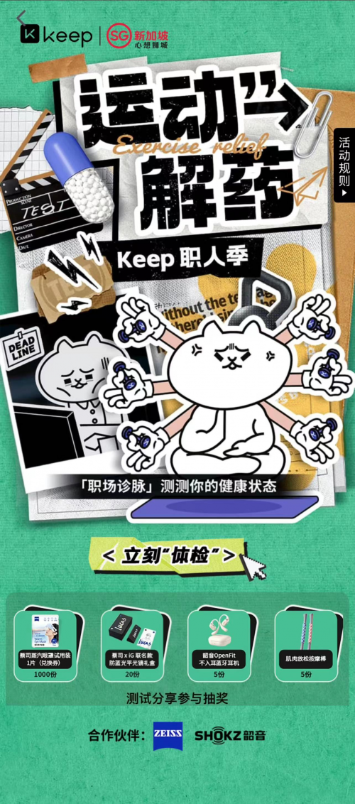 蔡司光學作為“職人季”合作伙伴,與Keep共同發起“職場診脈”的互動體驗報告,喚起職場人群保護眼健康的意識。蔡司光學一直致力于挖掘細分人群的用眼需求,為用戶提供專業的個性化解決方案,并通過跨界創新營銷模式不斷拓展用戶圈層。而Keep作為“運動科技第一股”,擁有大量熱愛運動的職場人士,蔡司光學借此契機成功對眼健康保護與視覺體驗的關注,推廣給更精準的職場人群,為Keep用戶提供個性化解決方案,精準觸達潛在消費人群,占領用戶心智。