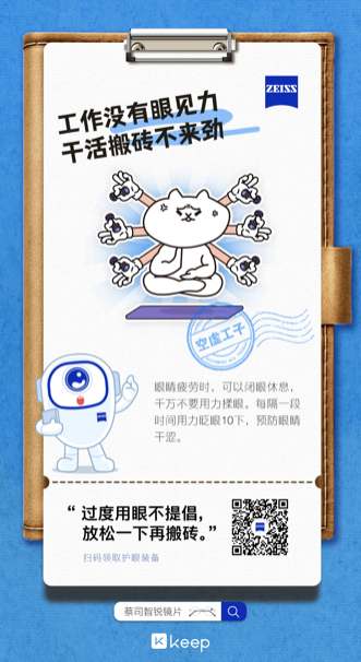 在本次活動中,蔡司光學倡導全民堅持良好的用眼習慣,并通過配戴合適的眼鏡保持清晰視覺,定期進行眼部體檢,及時發現眼部健康問題。系列創意海報,也通過生動有趣的文案和畫面,有效傳遞護眼理念,并激發用戶對蔡司智銳鏡片的興趣度與購買欲。