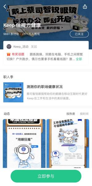 此次“職人季”創新跨界營銷活動,共計吸引65萬名用戶參與“職場診脈”活動,吸引超過13萬名用戶進行活動分享,蔡司光學也向超過23萬名用戶派發“護眼禮包”。蔡司光學在Keep的站內話題#Keep住視力健康,也從23年8月以來累積吸引23萬人關注,話題內有超過1萬名用戶分享運動用眼心得。