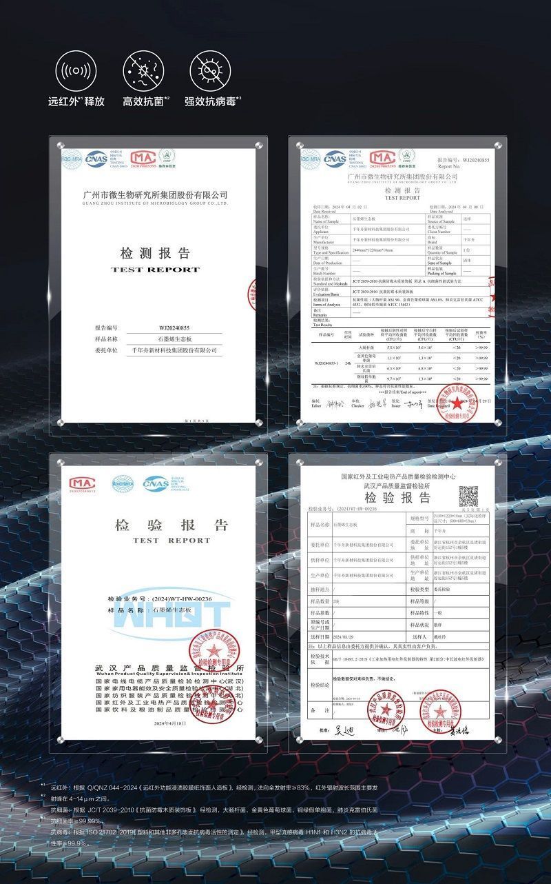 經第三方權威機構檢測,千年舟石墨烯生態板對大腸桿菌、金黃色葡萄球菌、銅綠假單胞菌、肺炎克雷伯氏菌抗細菌率≥99.99%;對甲型流感病毒H1N1和H3N2的抗病毒活性率≥99.9%,具有優良的抗菌、抗病毒功能,能夠有效守護全家人的四季健康。