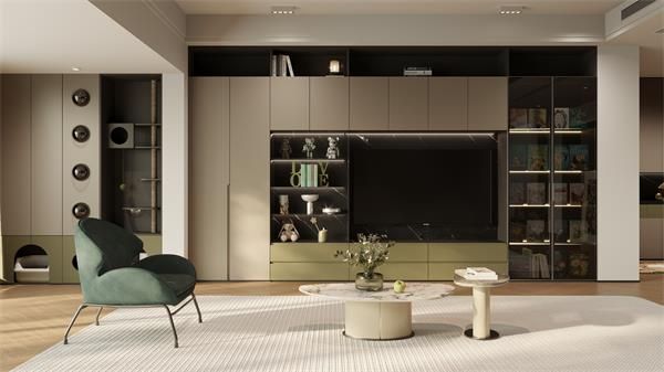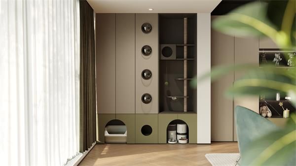 在整家布局中,“瓦爾登”系列充分發揮設計力,以貓咪太空艙、貓狗專屬喂食區、互動陽臺等特色功能區的設置,將寵物需求與人居動線結合,并不一昧地將人與寵物實現分隔,而是通過量身定制的實用分區,讓人寵互動能在更包容的空間中實現。