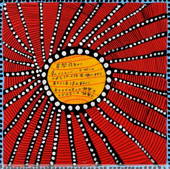 此次展覽是草間彌生在上海大田秀則畫廊洛克·外灘源新址的首展,將呈現(xiàn)其自2021年以來積極創(chuàng)作的《每天我都為愛祈禱》系列中的56幅繪畫以及新手稿。她以“文字”的形式更新了自己的表達(dá)語言。在網(wǎng)、點、側(cè)臉等代表性圖案重復(fù)出現(xiàn)的同時,草間經(jīng)常將馬克筆和丙烯顏料混合使用,在畫布上畫出一個或多個圓,并用日語或英語在圓中寫上自己的詩和信息。筆觸輕重緩急生動地傳達(dá)了她的呼吸節(jié)奏。這些文字充滿了詩人草間對生命的無限渴望和與世界分享藝術(shù)的意愿,以及對自身死亡的感知。