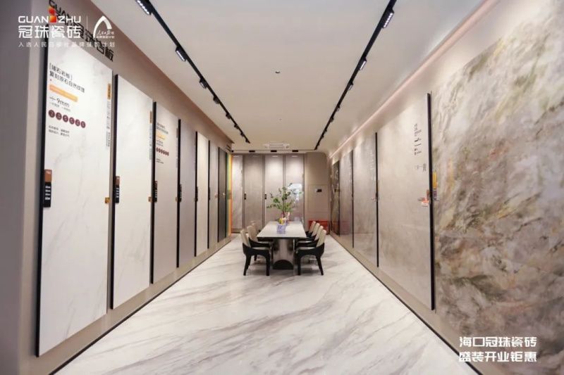 海口冠珠瓷磚旗艦店(萬佳店)立足當地消費者人居生活體驗及設計師空間設計選材需求,以巖板設計及應用展示為核心,打造了一個融合科技與文化的產品空間,為消費者提供多種空間解決方案,致力于為消費者帶來美好的家居體驗。
