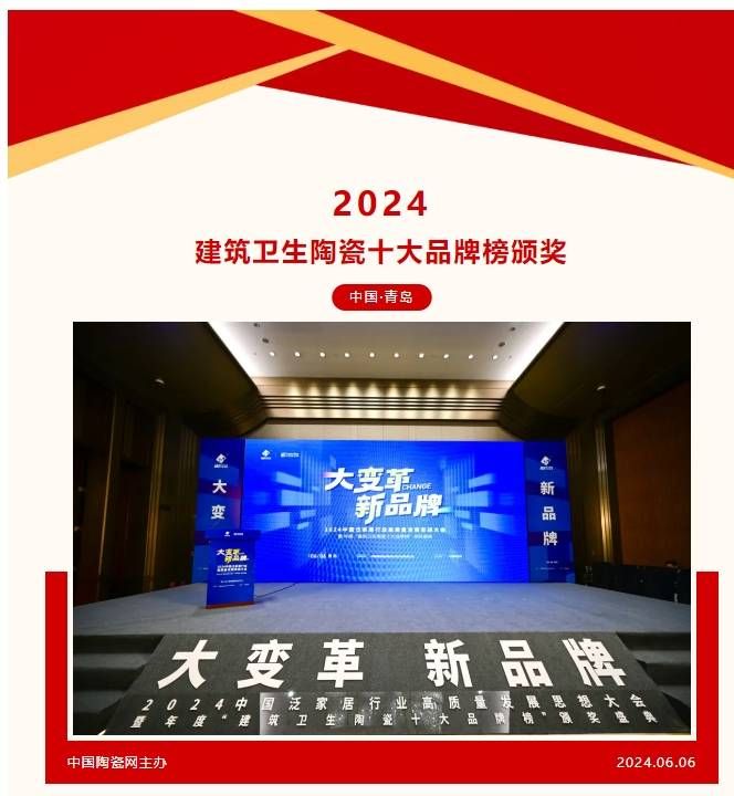 6月6日,由中國建筑裝飾裝修材料協(xié)會陶瓷分會指導(dǎo)、中國陶瓷網(wǎng)主辦的第十四屆中國泛家居行業(yè)高質(zhì)量發(fā)展思想大會暨2024年度“建筑衛(wèi)生陶瓷十大品牌榜”頒獎盛典,在青島國際會議中心隆重召開。行業(yè)內(nèi)外精英齊聚一堂,共話行業(yè)新格局、新發(fā)展、新趨勢。
