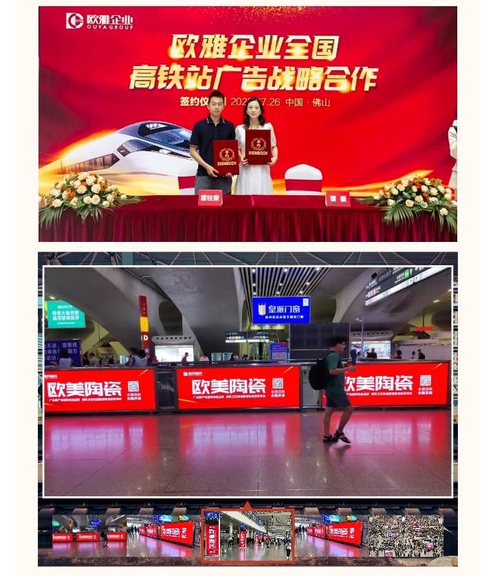 2023年開始,加大品牌宣傳力度是歐美陶瓷戰(zhàn)略升級的重要舉措之一。歐美陶瓷花重金投放全國高鐵站廣告,提升品牌聲量,通過多站點、高頻率、多維度的大規(guī)模曝光引流,增強(qiáng)品牌影響力,也能全渠道、高密度實現(xiàn)終端賦能,更好地贏戰(zhàn)終端市場。