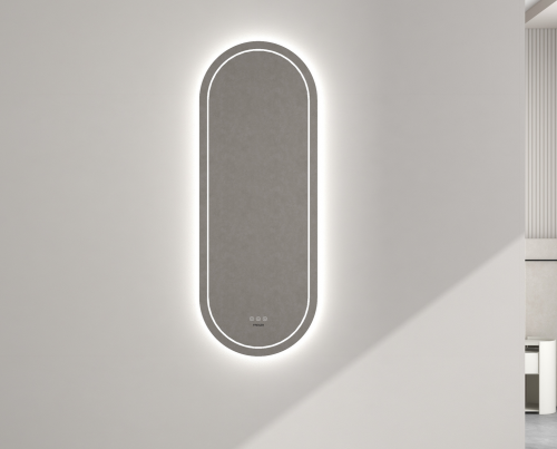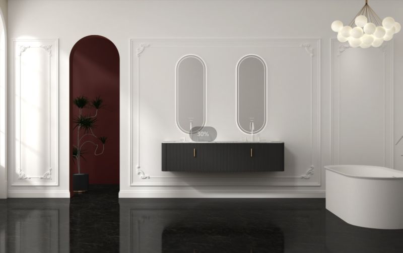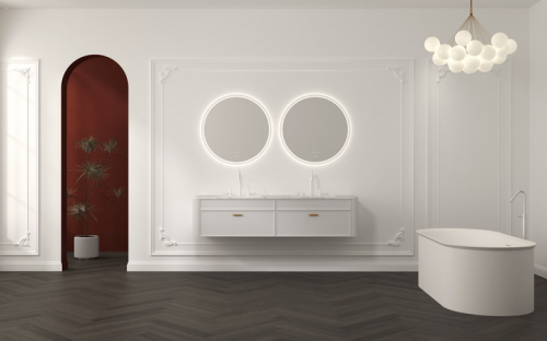 行業領先的3C認證雙跑道型智能鏡,不僅集成了三色溫和除霧功能,更在細節處彰顯法式設計的匠心獨運。對稱圓拱式的鏡面設計,巧妙地將古典主義中的拱門元素進行幾何化重塑,鏡背氛圍燈與內沿環繞式打砂光圈相輔相成,如同法式石膏線般細膩勾勒,既保留了法式的古典韻味,又展現出簡約而不失靈動的現代氣息。