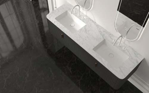 將法式風情與現代生活美學完美融合,馬利克浴室柜以其獨特的波浪型柜門設計,立體靈動地勾勒出法式浪漫的輪廓。主柜柜體可選沉穩內斂的錦瀾深灰,或是清新雅致的香草淺灰,兩種配色方案各具特色。大理石圓弧臺面紋理張揚、色彩自然,延續了法式建筑中的經典圓弧設計,展現出低調典雅的奢華質感。