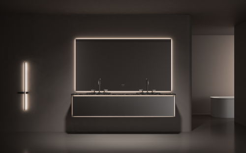 主柜摒棄了一切多余的繁復設計,僅以最純粹的線條勾勒出簡約的輪廓,至簡而不失優雅。搭配上星霧灰金屬漆抽面,更顯大氣格調。柜體四周環繞式的隱匿燈帶輕輕亮起,如同夜空中最溫柔的指引,為浴室空間增添了一抹神秘與溫馨。盧森諾浴室柜,簡而不乏格調,奢而不顯張揚,將“簡”與“奢”的平衡之美展現得淋漓盡致。