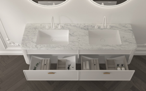 立體造型的功能雙抽,提供了大容量的收納空間,讓洗浴用品的擺放井然有序。大圓弧油漆主柜,觸感絲滑溫潤,搭配上高級精致的大理石臺面,提升了整體的檔次感。同時,其臺邊可做造型、無縫拼接臺下盆工藝,既美觀又實用。