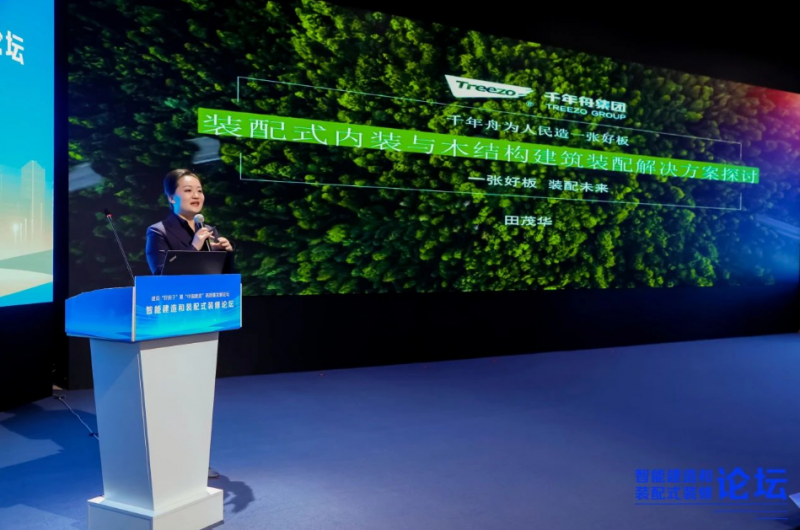 在這場匯聚了行業(yè)精英與前沿思想的盛會中,千年舟集團作為行業(yè)領(lǐng)先的綠色建筑材料解決方案提供商及木結(jié)構(gòu)裝配式建筑踐行者,集團副總裁田茂華女士受邀出席了“智能建造和裝配式裝修”分論壇,并發(fā)表了題為《裝配式內(nèi)裝與木結(jié)構(gòu)建筑裝配解決方案探討》的精彩演講。