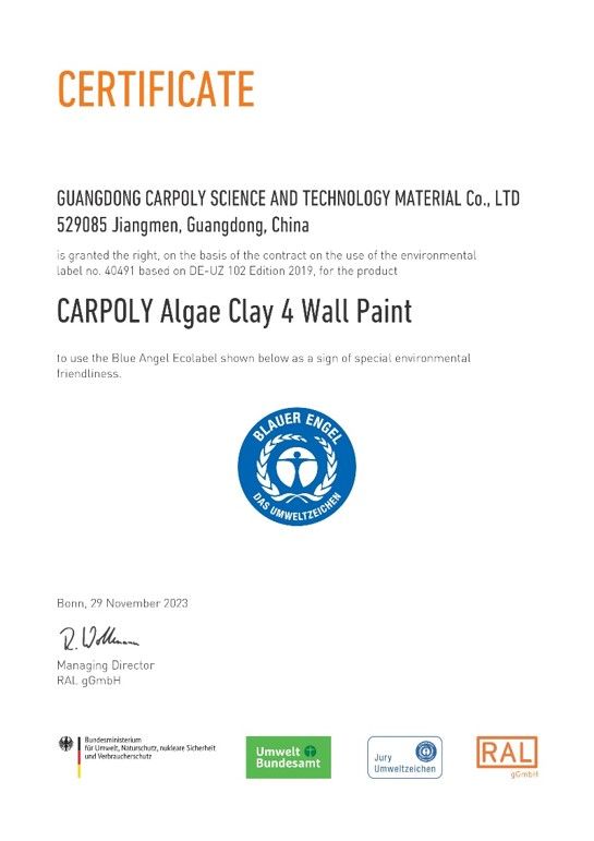 德國藍天使認證,是全球公認的極其嚴格的環保標準,被譽為“環保天花板”。它不僅關注消費者使用安全,確保家居裝修綠色環保,還針對室內裝修常見污染物及影響人體健康的有害物有嚴格的限制要求。藍天使認證不僅要求產品中防腐劑、殺菌劑含量極低,呵護居家安全;而且對甲醛和VOC含量的控制非常嚴格,有害物檢測限值遠遠低于國家標準。此外,藍天使認證還要求上游原材料可能產生的廢料排放有明確限值要求,保障環境安全。同時,藍天使認證實行多維監控,產品送檢+市場抽檢,切實保障產品的穩定高品質。獲得藍天使認證,無疑是對嘉寶莉海藻泥4代墻面漆環保性能的極高認可。