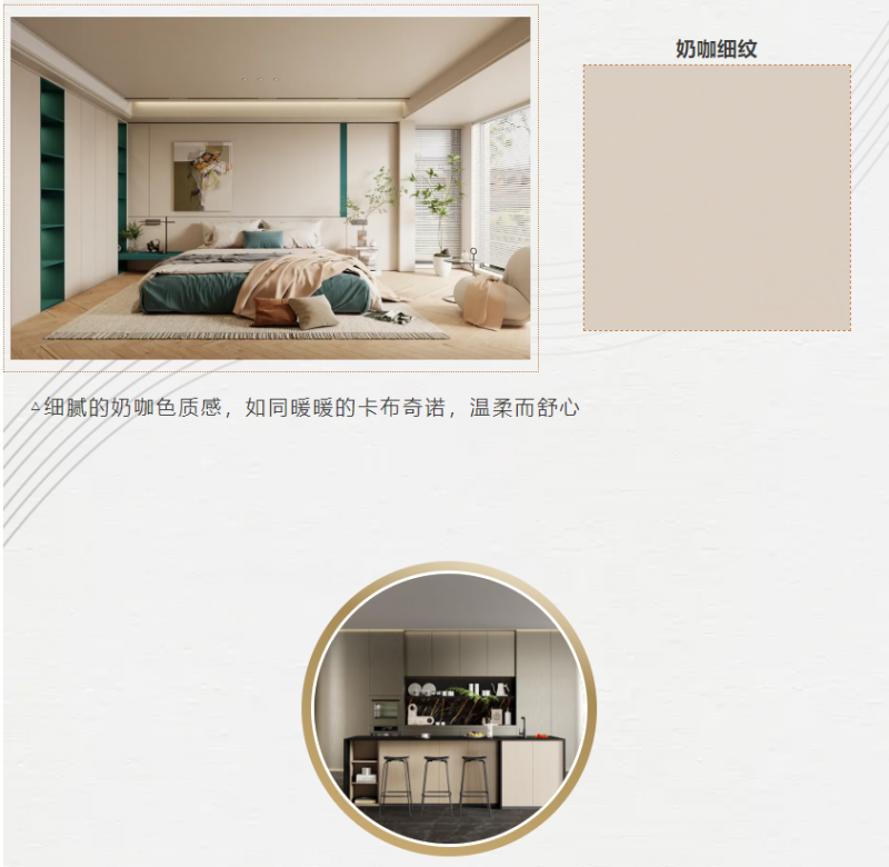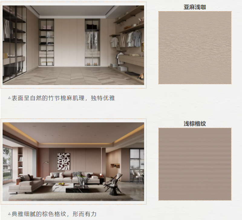 肌理紋的質感更具自然簡約、古典優雅的氣韻。千年舟PET輕顏板高端花色——肌理系列共5款:亞麻淺咖、淺棕格紋、淺咖藤織、玄咖細紋、奶咖細紋。亞麻、編織、格紋、細紋,溫柔靈動、細膩自然,是追求自然與環保、典雅與藝術的空間美感。