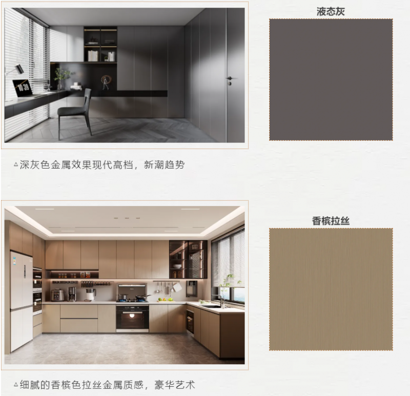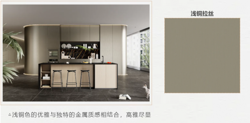 金屬賦予的材質和光澤,高級感油然而生。在光影下明暗自然,大大提升空間的光澤活力與層次質感。千年舟PET輕顏板高端花色——金屬系列共5款:液態金、液態銀、液態灰、香檳拉絲、淺銅拉絲,可搭配多種花色,可廣泛應用在衛生間、廚房、客廳等領域。