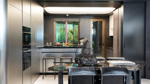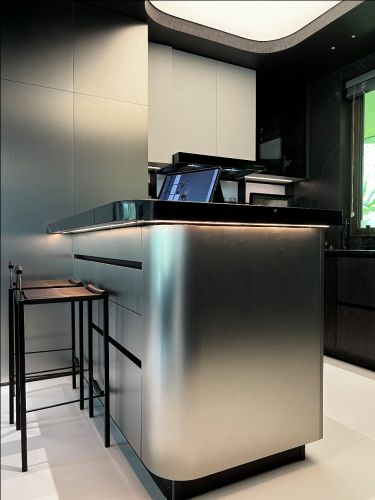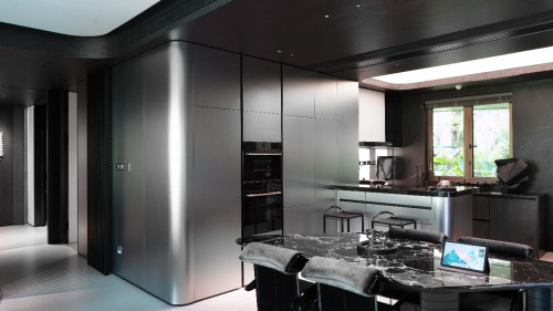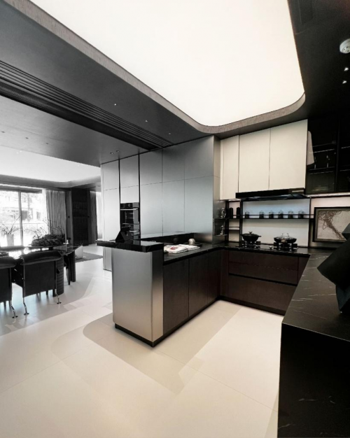 德國瑪婭在麓湖生態城項目中,巧妙運用了黑、白、灰經典色調,在此基礎上,將金屬拉絲紋理和自然木紋巧妙結合,結合金屬材料的冷峻感與木材帶來的溫暖觸感,營造出一種既奢華又溫馨的空間氛圍。不僅增強了廚房區域的藝術美感,同時也讓烹飪過程變得更加享受。