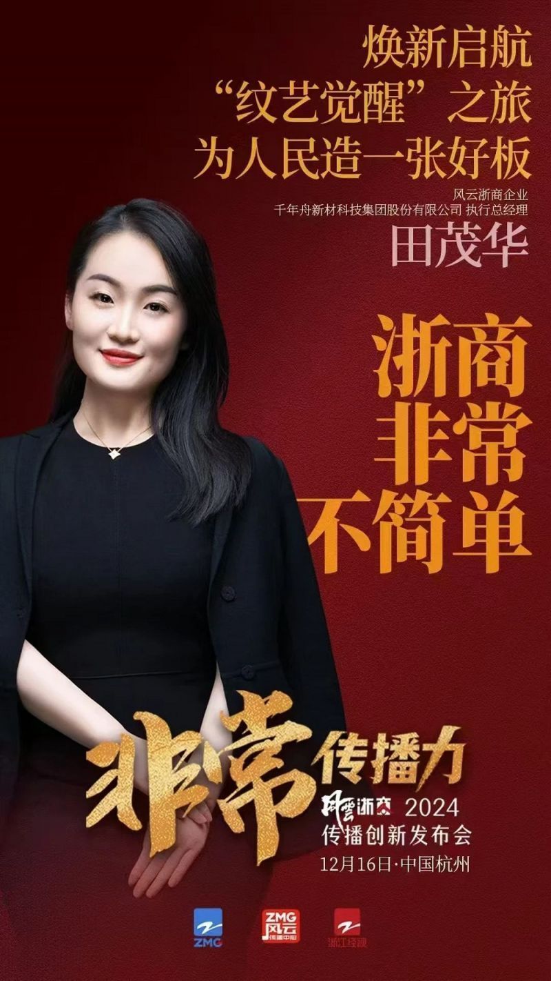以“非常”之力,創(chuàng)“非凡”之勢。12月16日,由浙江廣播電視集團(tuán)主辦,ZMG風(fēng)云傳播中心承辦的《非常傳播力——2024風(fēng)云浙商傳播創(chuàng)新發(fā)布會(huì)》在杭州隆重召開,千年舟集團(tuán)執(zhí)行總經(jīng)理田茂華作為風(fēng)云浙商企業(yè)代表受邀出席本次大會(huì),通過對話分享,共話行業(yè)發(fā)展方向。