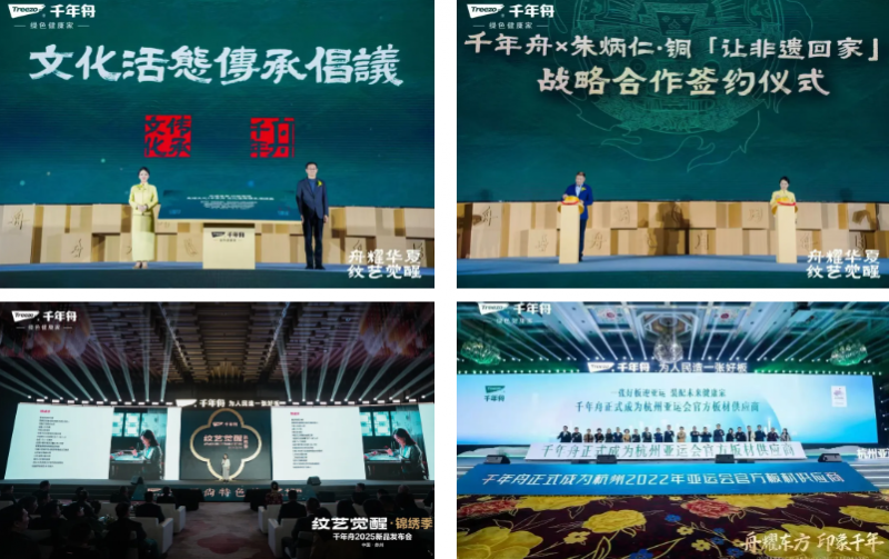 2023年,中國國潮經(jīng)濟(jì)市場規(guī)模達(dá)兩萬億元,《2024雙十一消費(fèi)洞察報(bào)告》顯示的TOP10品牌中,國貨品牌占據(jù)7席。千年舟抓住這一趨勢,推出了一系列以傳統(tǒng)文化為靈感的花色產(chǎn)品,如“風(fēng)雅宋韻”、“人文西湖”、“人文良渚”等;并參與杭州亞運(yùn)會(huì)等大型活動(dòng)建設(shè),提升品牌影響力;此外,還與浙江省文物保護(hù)利用協(xié)會(huì)共同發(fā)起“文化活態(tài)傳承”倡議,聯(lián)合運(yùn)河申遺發(fā)起人之一、國家級非遺銅雕技藝代表性傳承人朱炳仁先生,共同倡議“讓非遺回家”,同時(shí)攜手國家級非遺項(xiàng)目蘇繡代表性傳承人姚建萍老師,將銅雕、蘇繡等傳統(tǒng)工藝融入產(chǎn)品設(shè)計(jì),“見人、見物、見生活”,撰寫美好家居。