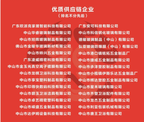 大會還對歐派克、金耀華玻璃、安可防爆膜等 28 家協(xié)會優(yōu)質(zhì)供應(yīng)鏈企業(yè)進行了表彰,徐偉會長表示,“集成全球供應(yīng)鏈,成就世界好浴房”,這是我們成功的法寶。中山淋浴房產(chǎn)業(yè)的輝煌,得益于我們完整的產(chǎn)業(yè)鏈,涵蓋五金、膠條、玻璃、型材、滑輪等上下游行業(yè)的共同努力。正是你們的卓越貢獻,推動我們在中山實現(xiàn)了100億產(chǎn)值,成為中山美居的核心力量。