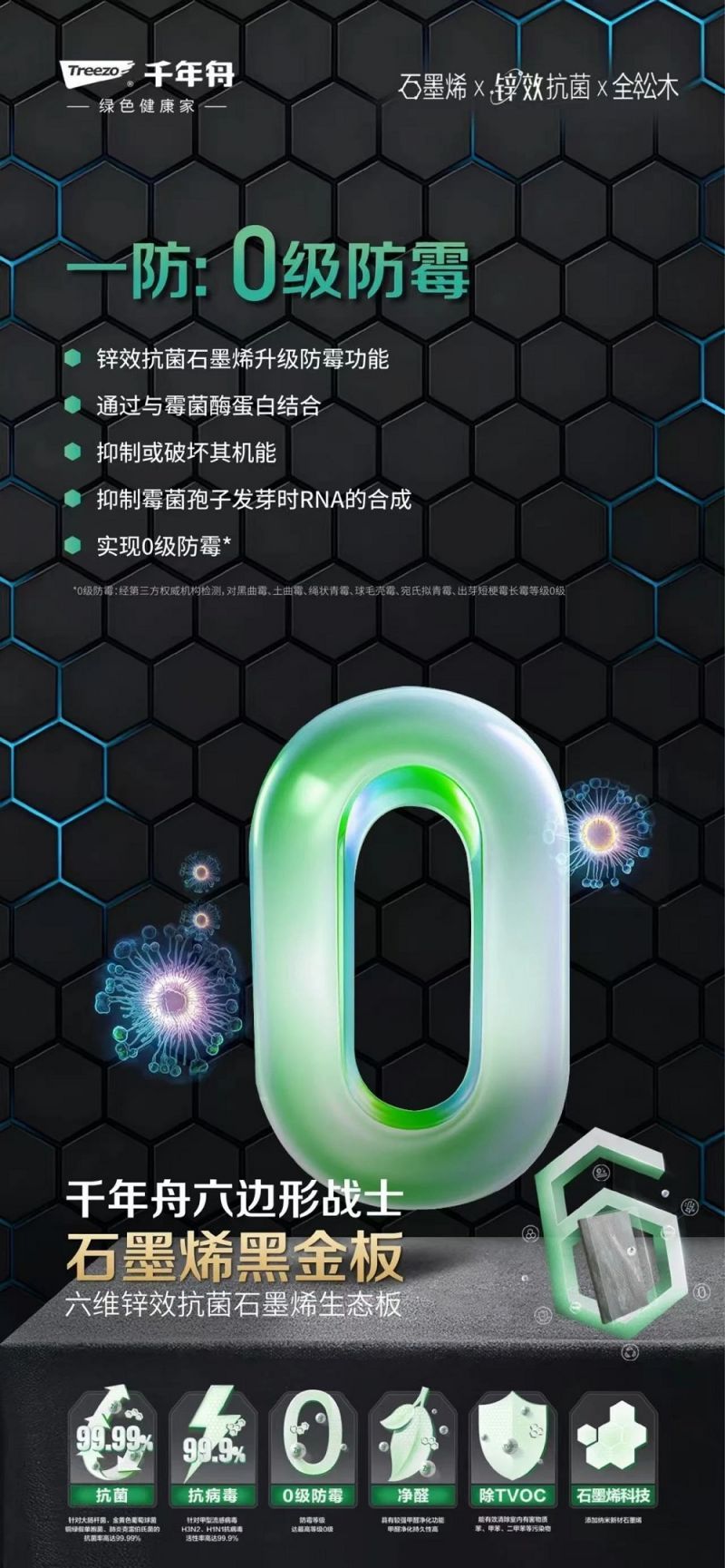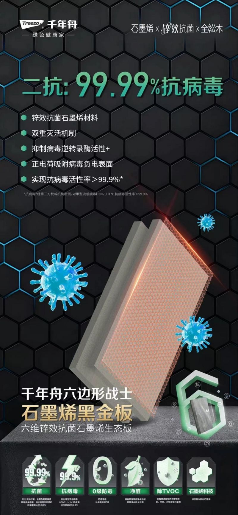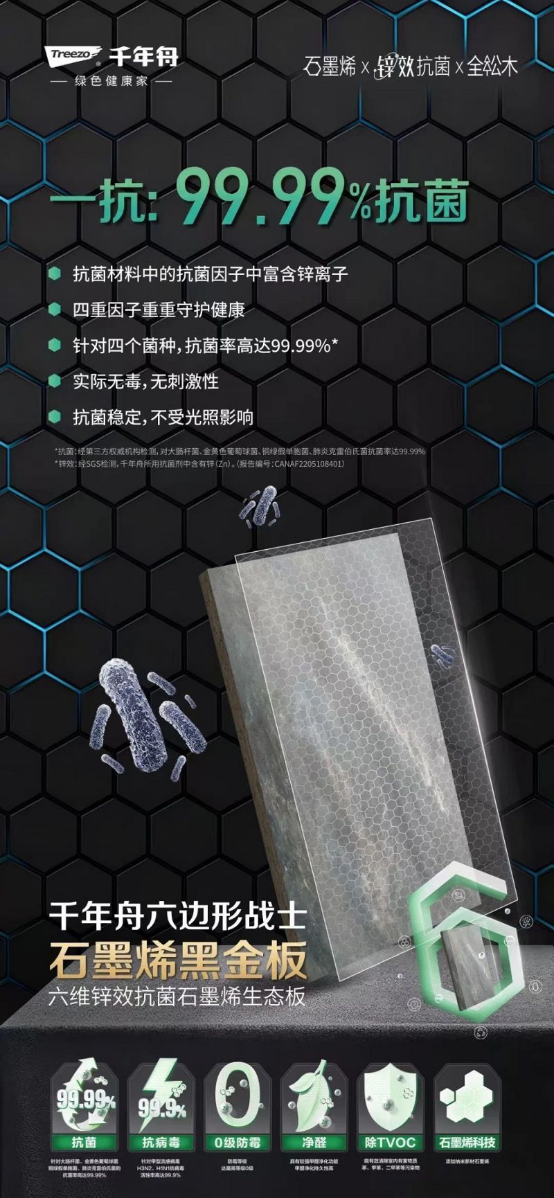 作為家居健康的隱形守護者,千年舟石墨烯黑金板將神秘的石墨烯科技與實用的鋅效抗菌技術巧妙結合,為你打造一個抗菌、抗病毒、防霉、凈醛、除TVOC于一體的六維健康防護圈,讓家成為最安全的港灣。