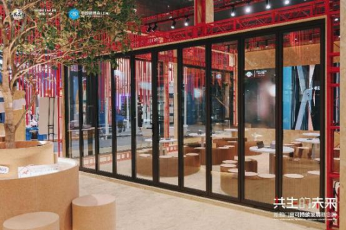 派雅門窗可持續發展概念展以可循環利用的模塊化骨架為基礎,通過通透的節能門窗系統串聯起“城市燈火”與“生態綠洲”。外立面的國雅紅幕墻象征萬家燈火的溫度,內場則通過全景推拉門、折疊門、落地窗等產品,消弭建筑與自然的邊界。
