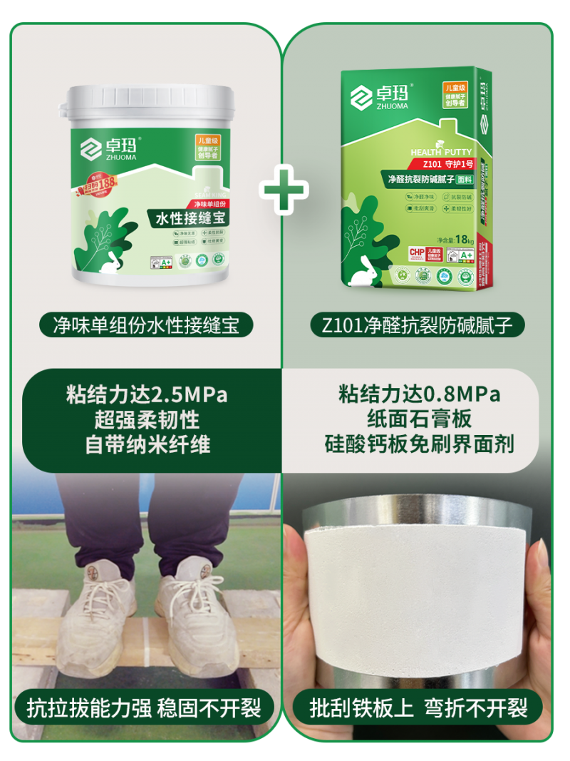 環(huán)保與強(qiáng)度雙突破:卓瑪膩?zhàn)硬粌H通過了兒童安全級認(rèn)證及綠色建材三星級認(rèn)證,其甲醛、VOC等有害物質(zhì)未檢出,粘結(jié)強(qiáng)度更是超國標(biāo)2倍,從根源上解決了墻面開裂、脫落等問題。比如Y型膩?zhàn)?,國家?biāo)準(zhǔn)對粘結(jié)強(qiáng)度的要求是≥0.3MPa,卓瑪做到了0.8MPa,N型膩?zhàn)?,國家?biāo)準(zhǔn)對粘結(jié)強(qiáng)度的要求是標(biāo)準(zhǔn)狀態(tài)下≥0.5MPa,浸水后≥0.3MPa,卓瑪做到了標(biāo)準(zhǔn)狀態(tài)下≥1.1MPa,浸水后≥0.8MPa,達(dá)到這種品質(zhì),墻面的硬度、附著力非常強(qiáng)大,即使墻面二次翻新,也無需鏟除墻面,直接涂刷翻新即可。