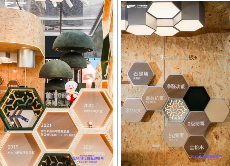 現(xiàn)場,備受矚目的千年舟六邊形戰(zhàn)士-石墨烯黑金板(六維鋅效抗菌石墨烯生態(tài)板)吸睛萬千,它是千年舟與浙江大學、高烯團隊深度合作的科技板材最新成果。它以優(yōu)質(zhì)松木為基材,將“新材料之王”石墨烯與鋅效抗菌技術強強聯(lián)合,構建起石墨烯、抗菌、抗病毒、防霉、凈醛、除TVOC六維防護體系,如同一位全能的“六邊形戰(zhàn)士”,全方位升級健康守護。