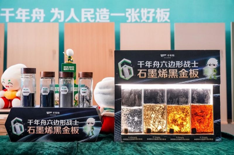 其中,“六邊形戰士”石墨烯黑金板作為千年舟與浙江大學高烯團隊聯合研發的重磅力作,憑借石墨烯材料在抗菌抗病毒、防霉、凈醛、除TVOC等方面的特性,打造出真正意義上的“健康功能板”。其基板采用千年舟日照工廠自產的全松木板材,全面實現環保性能與功能拓展的雙重躍升,代表了千年舟在綠色科技應用上的前沿探索。