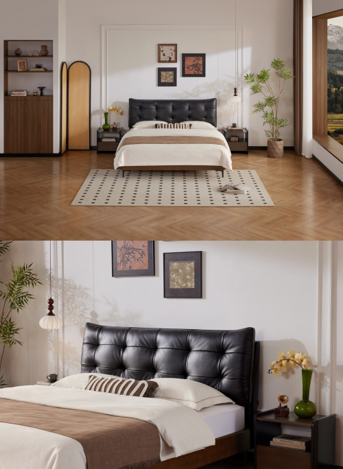 可可皮床(LH.B1022PQ1)融合牛皮床頭和實木框架,材質的混搭正是古典與現代的交融,雙層靠包、拉點設計無不營造舒適靠感和臥室美感,讓中古風洋溢在臥室生活的每處角落。