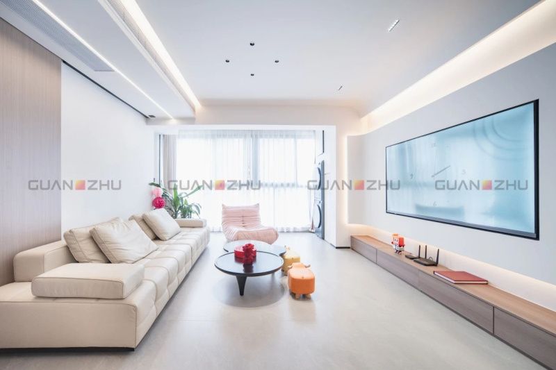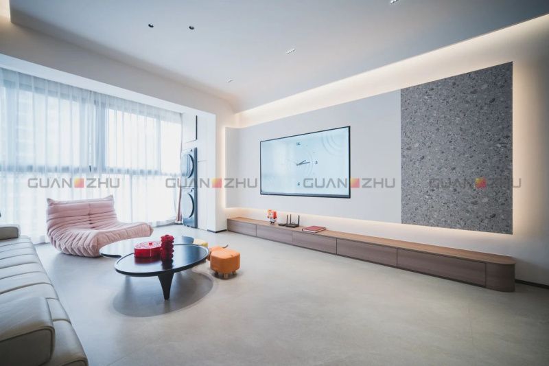 在客廳設計中,屋主Aison非常注重布局的靈活性,他將原本的三室改為兩室,并解釋道:“如果再多一個新的家庭成員,我們也可以輕松地將半開放書房改造成一個獨立的房間,不會影響整體的居住體驗。”全屋鋪貼冠珠微光石流沙-硯灰,其流動的紋理宛如細膩沙粒,輕盈鋪灑于地面,將所有看似碎片的空間重組完整,讓家的溫暖與愛意靜靜流淌。