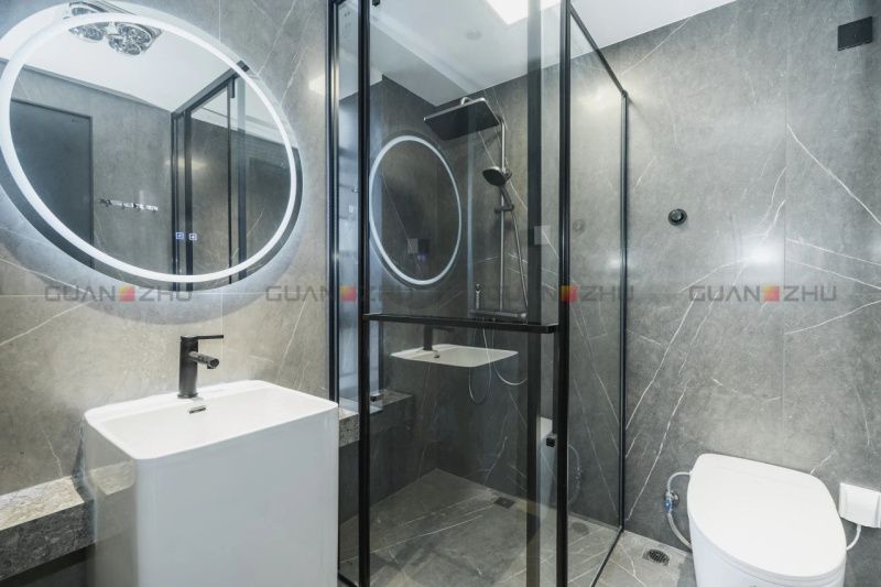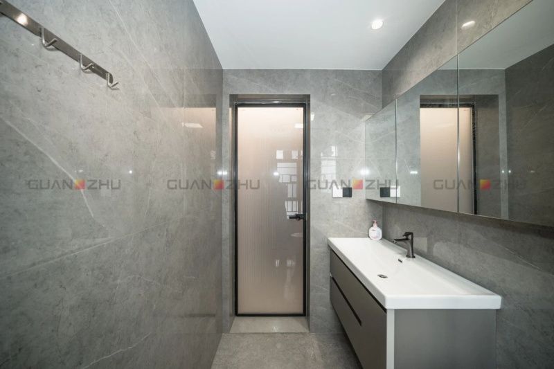次衛則采用二分離式布局,淺灰調將溫柔質感延續至每一寸空間。而極簡設計減少了空間的擁擠感,讓日常使用更加舒適與高效。墻面冠珠保加利亞淺灰其純凈的淺灰色磚面搭配不規則的冰裂狀白色紋理,為整個空間注入了一種清新與靈動。地面則鋪貼另一款深色磚,形成上淺下深的搭配,賦予空間一種穩重而溫馨的氛圍。