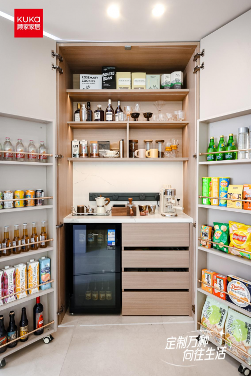 餐廚一體的島臺(tái)讓做飯轉(zhuǎn)身即成社交,動(dòng)線縮短60%,破解用戶“做飯像坐牢”的隔離感;家庭圖書館用隱藏式收納化解育兒焦慮,去客廳化設(shè)計(jì)將空間變?yōu)椤叭夜沧x角”;冰箱零食柜分層收納快樂,實(shí)現(xiàn)“追劇能一鍵進(jìn)入肥宅快樂模式”的即時(shí)滿足。
